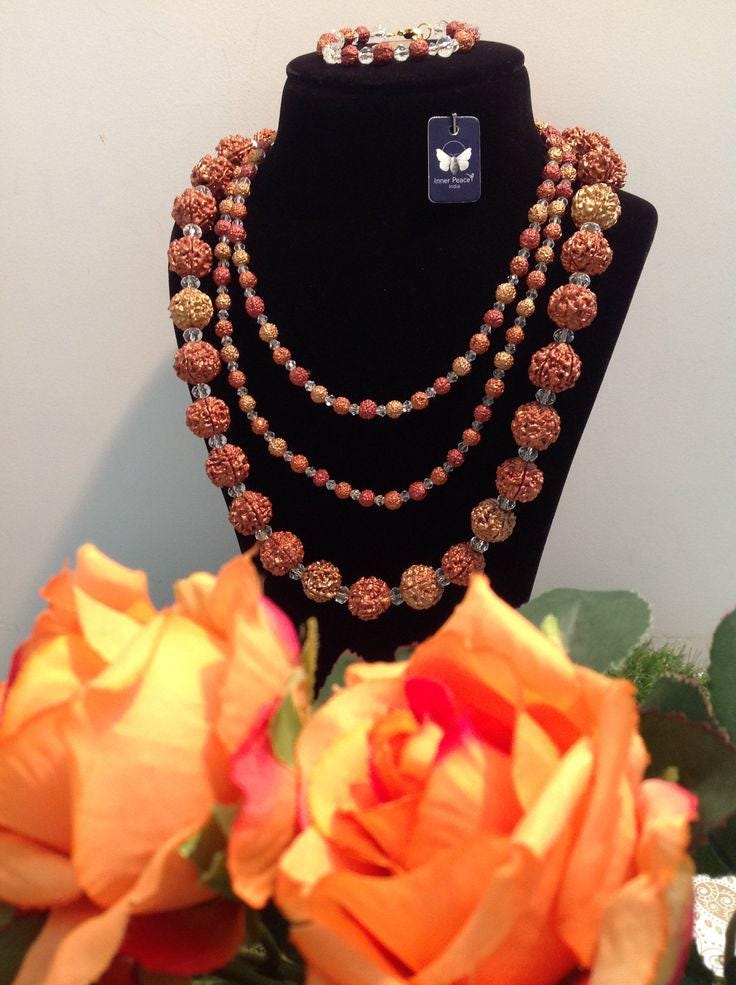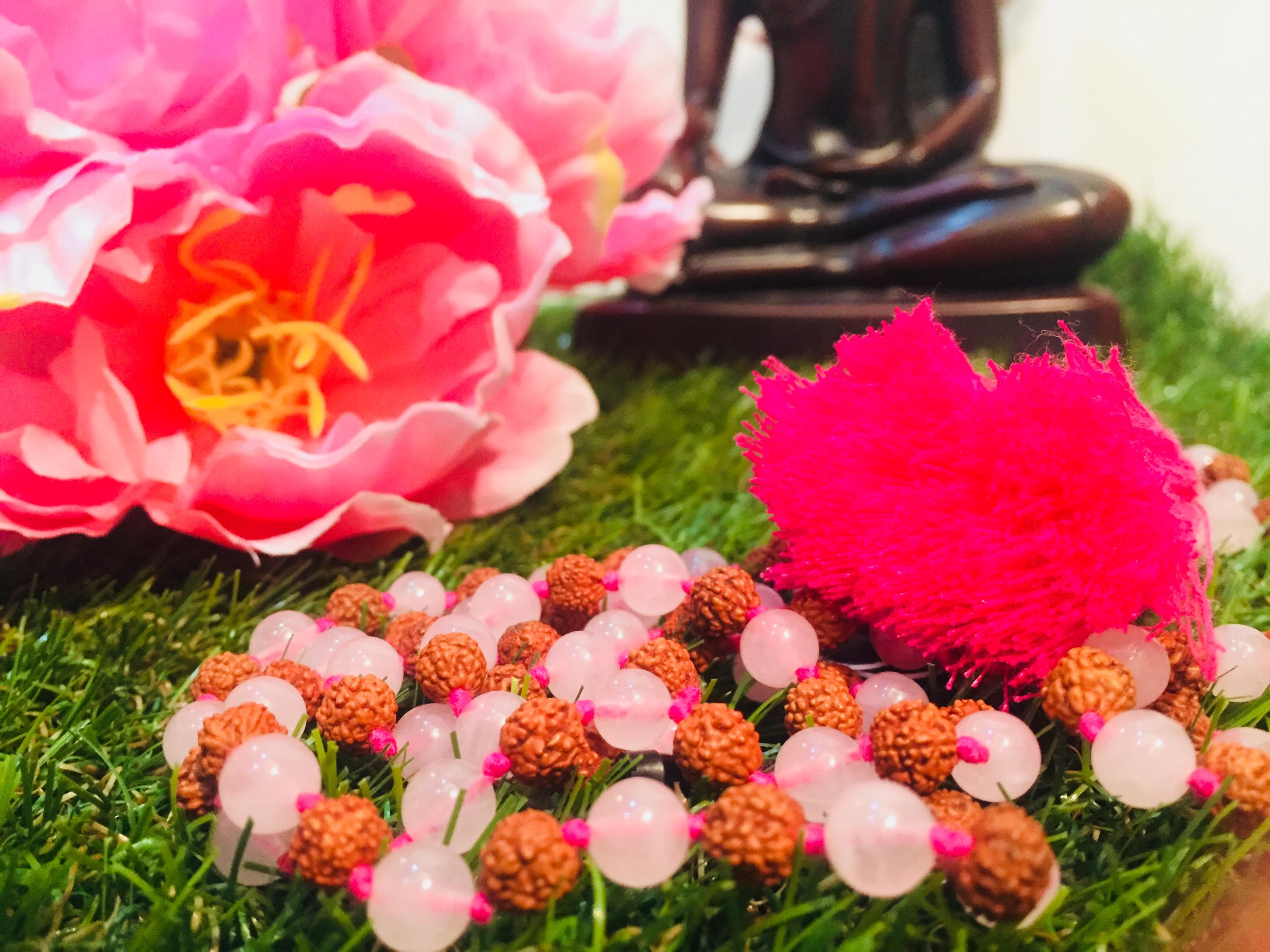 rose quartz and rudraksha beaded necklace / 108 jap mala