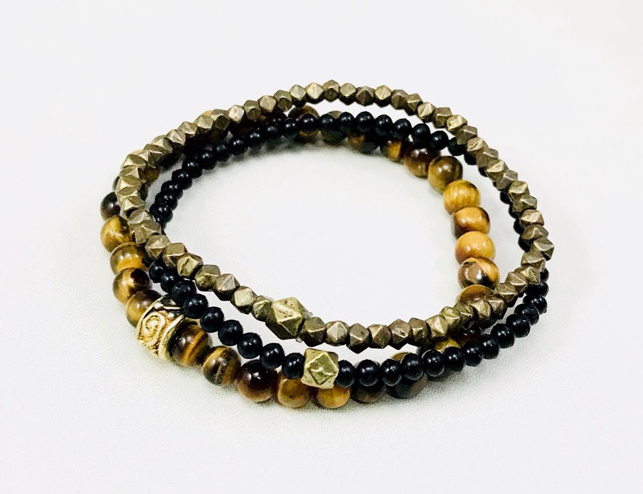 Tiger eye, metal and black bead combination bracelets.