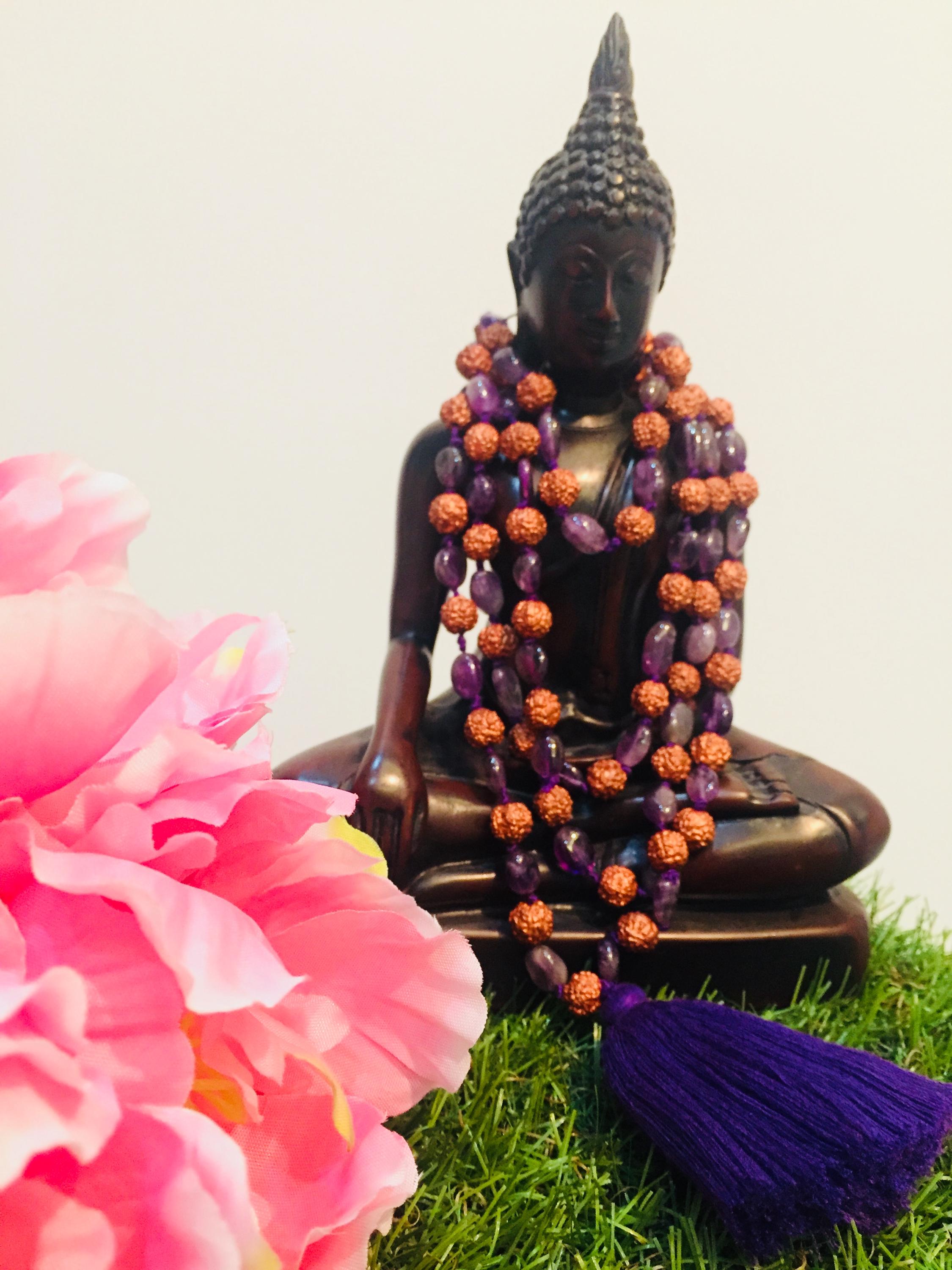 Amethyst and natural rudraksha beaded 108 rosary / jap mala.